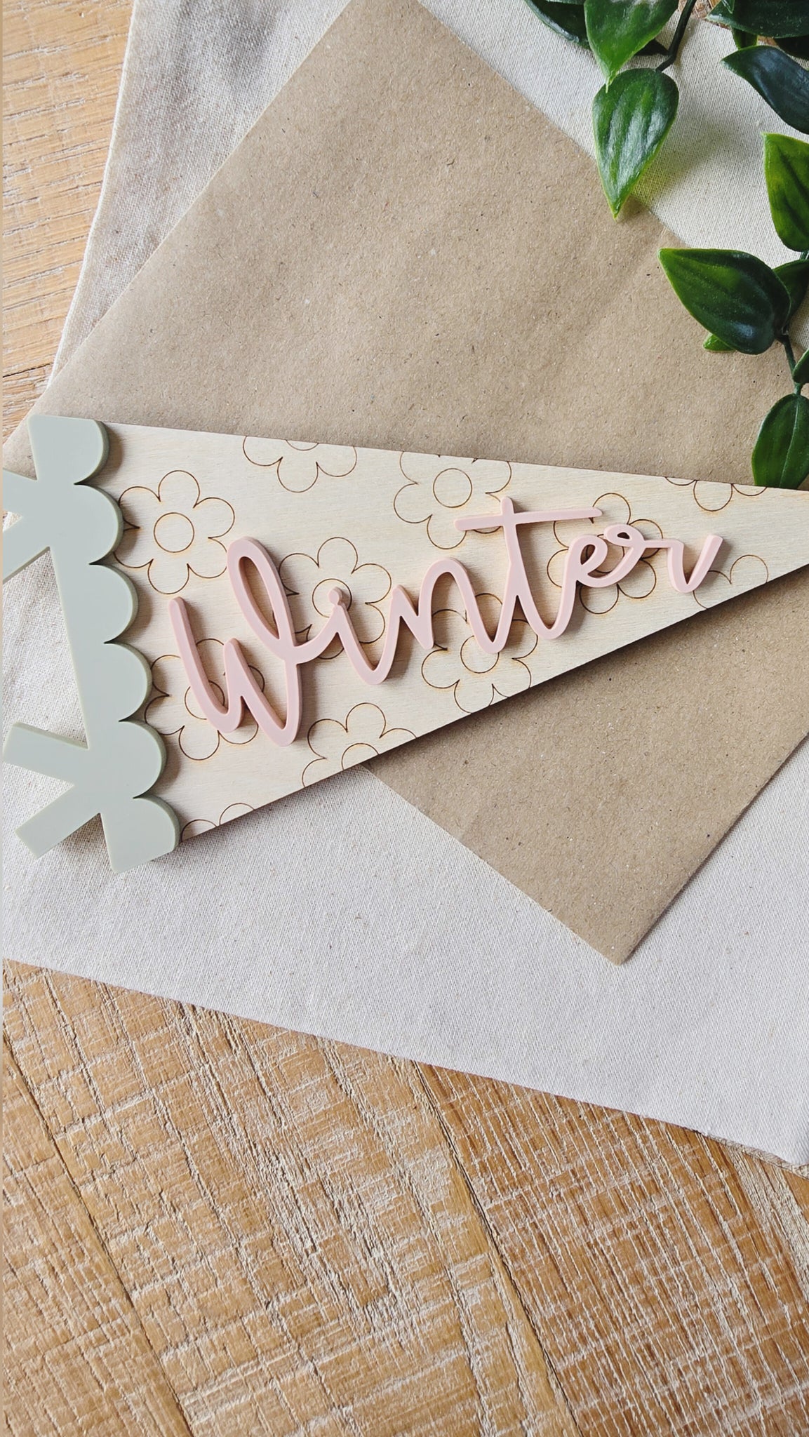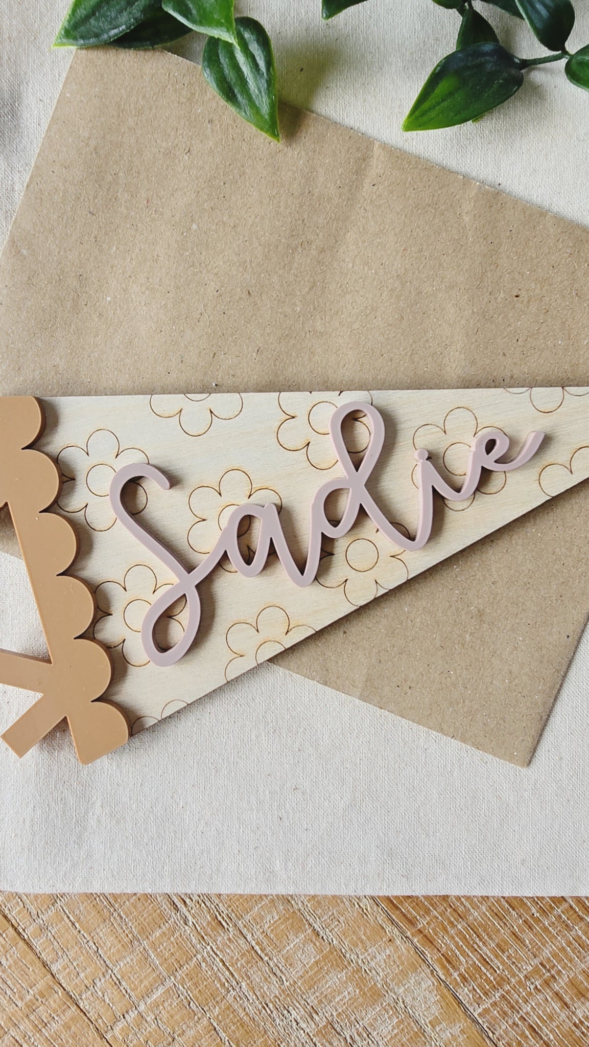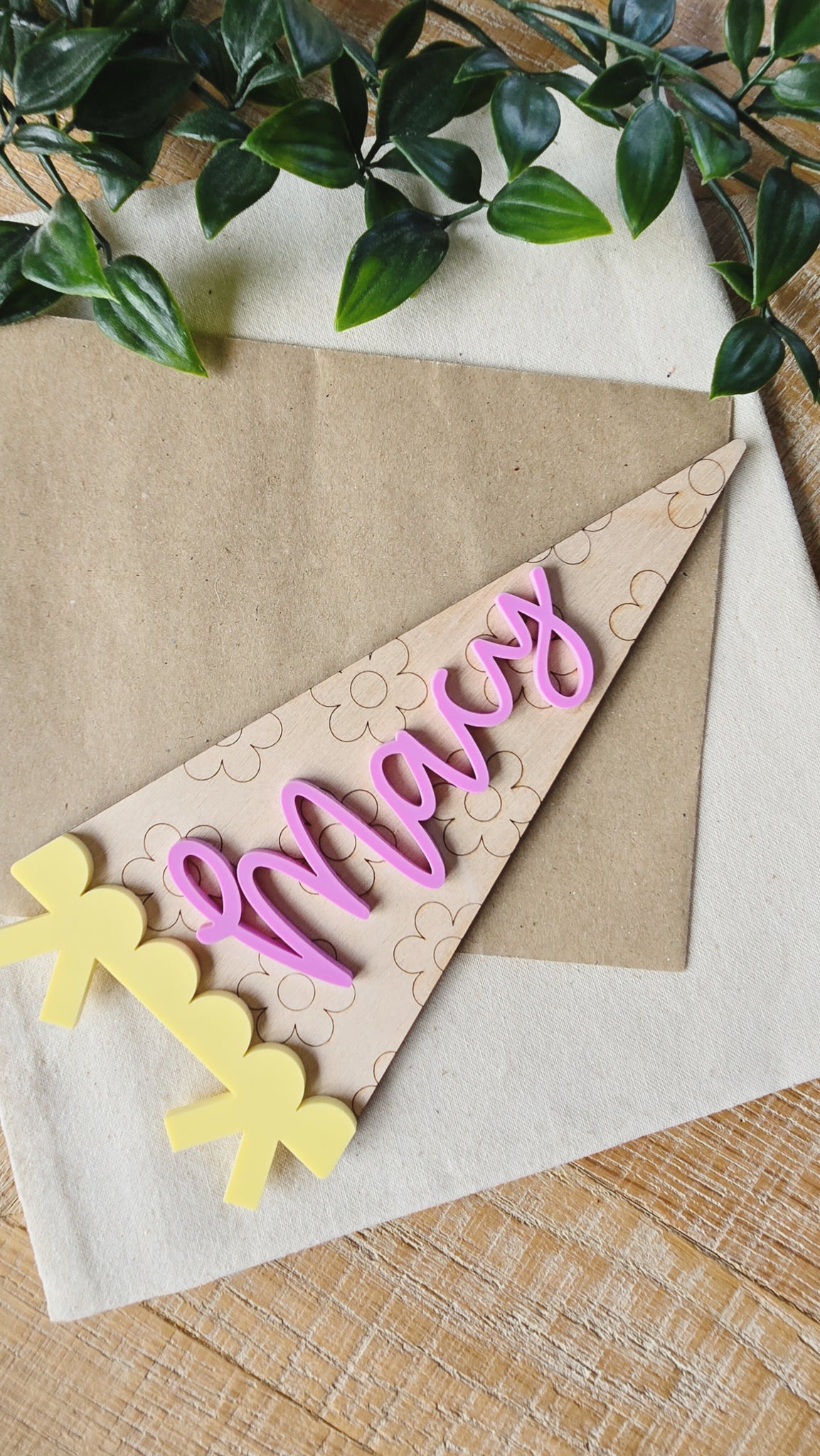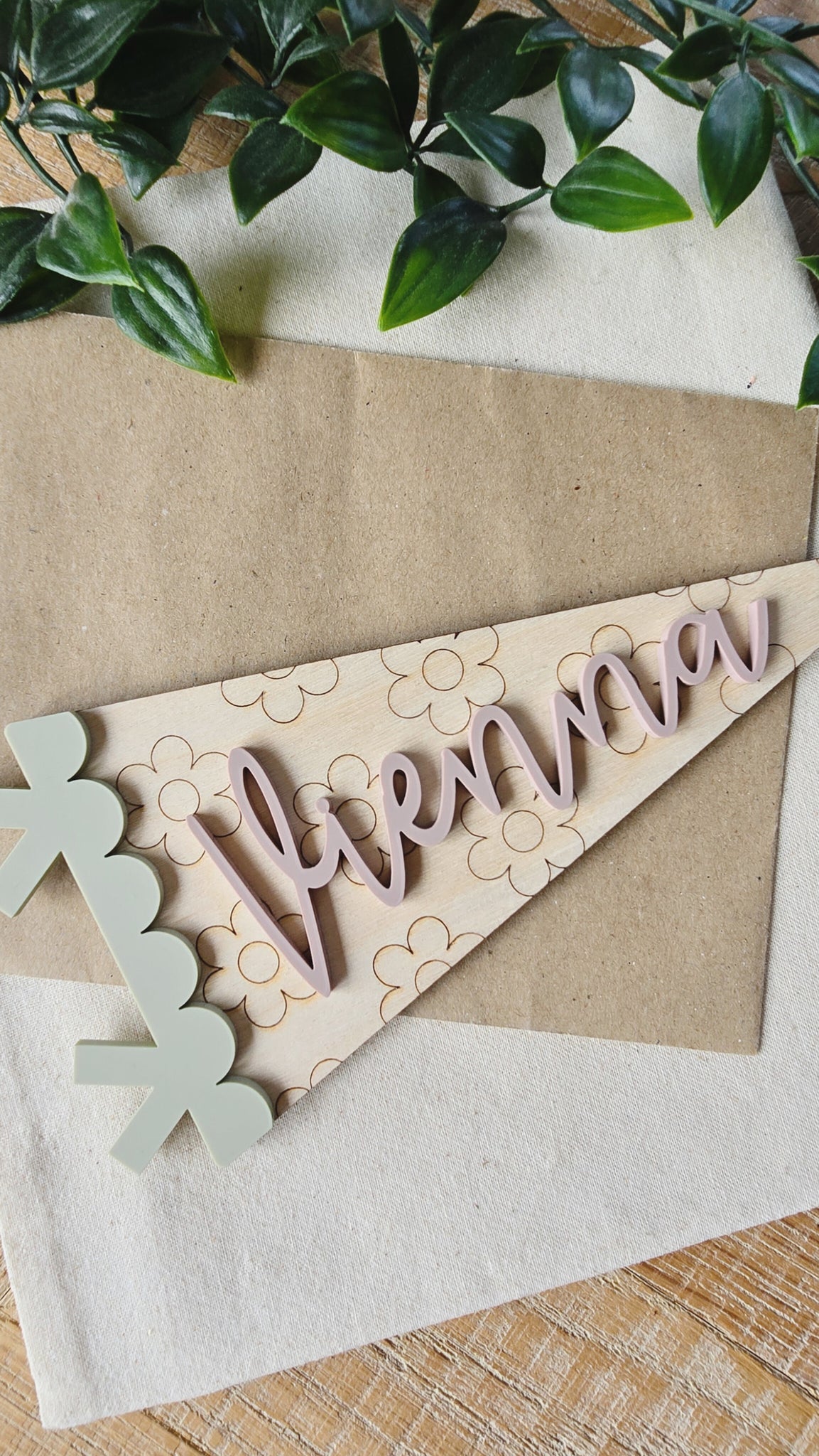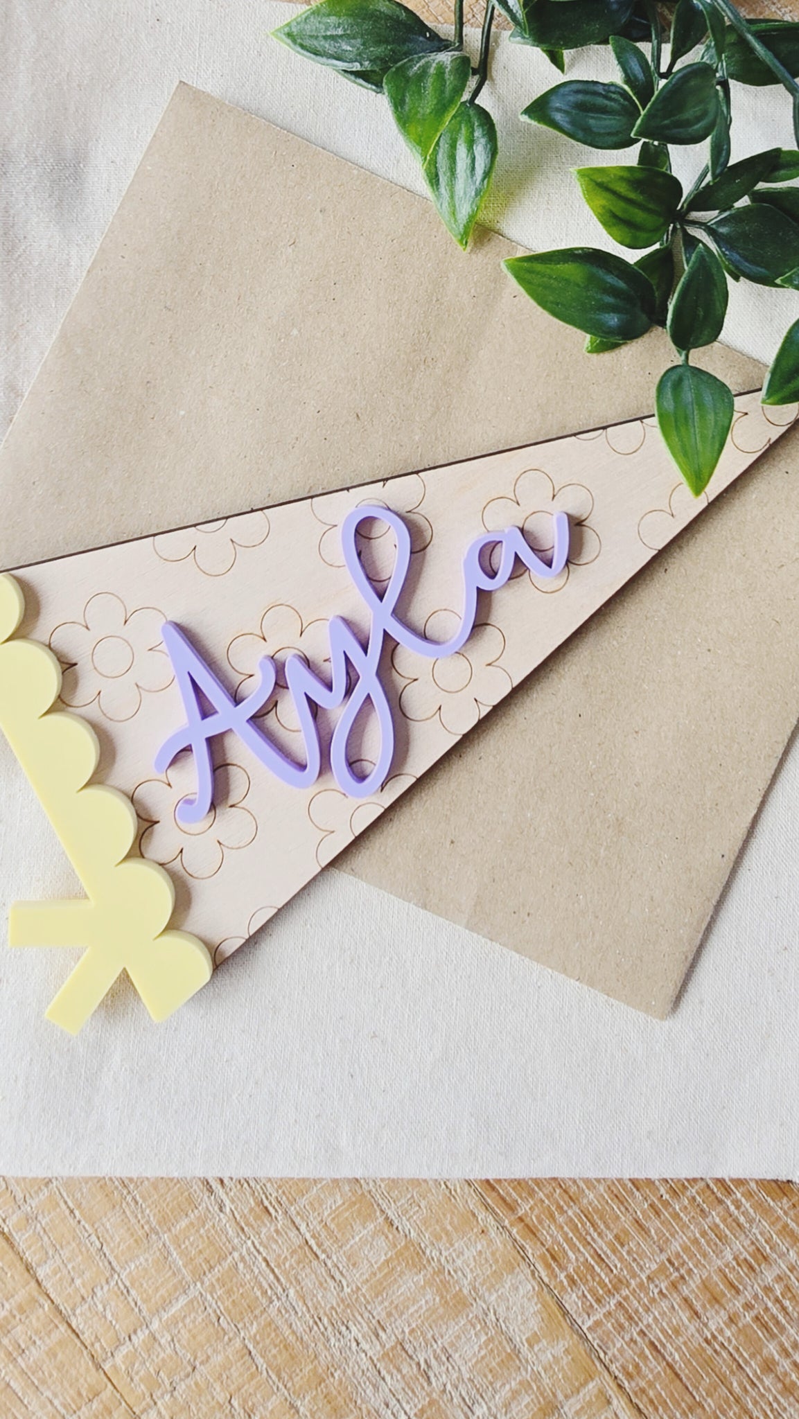 This sweet floral pennant adds a playful, personalised touch to your little one’s room. Made from 4mm birch plywood with engraved flowers and finished with a 3mm matt acrylic name in your chosen colour.