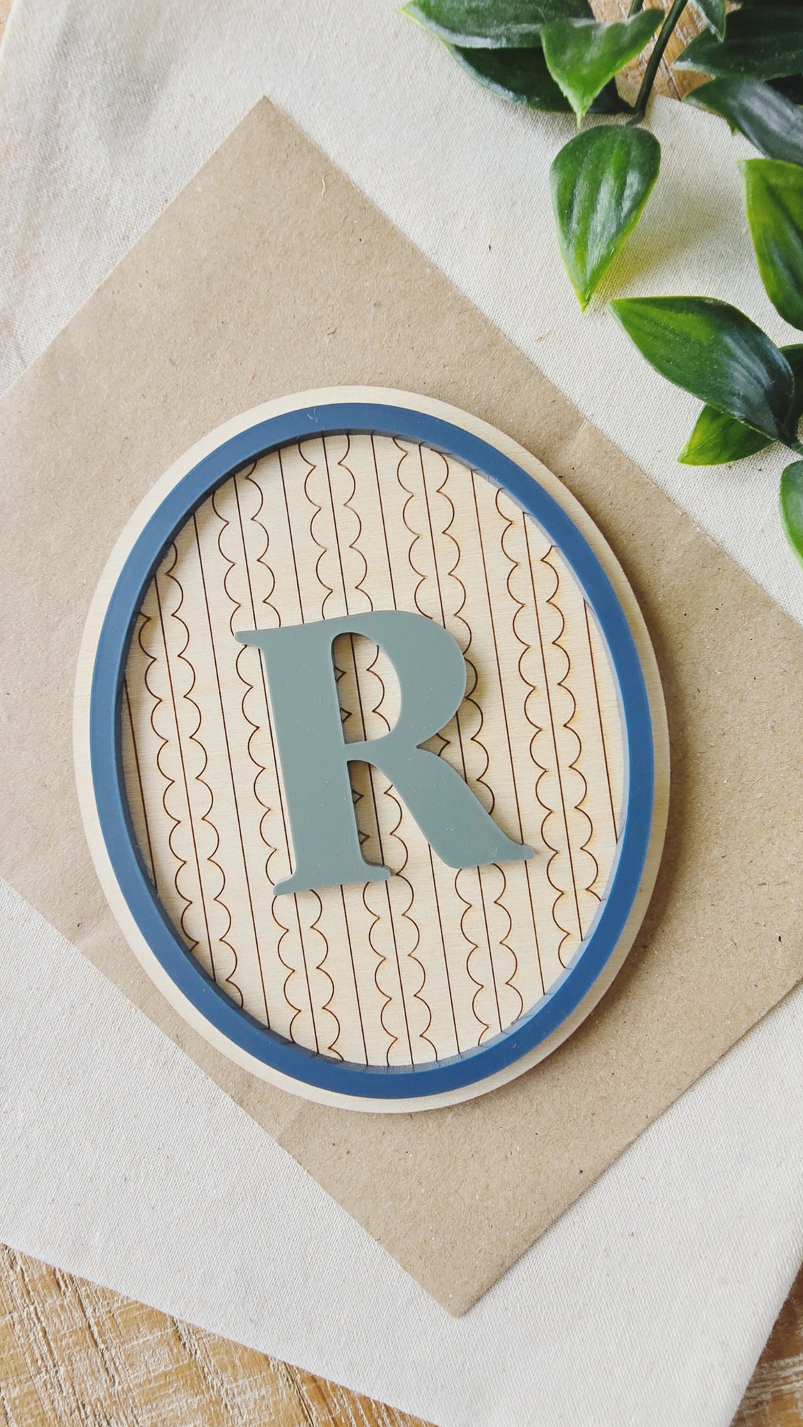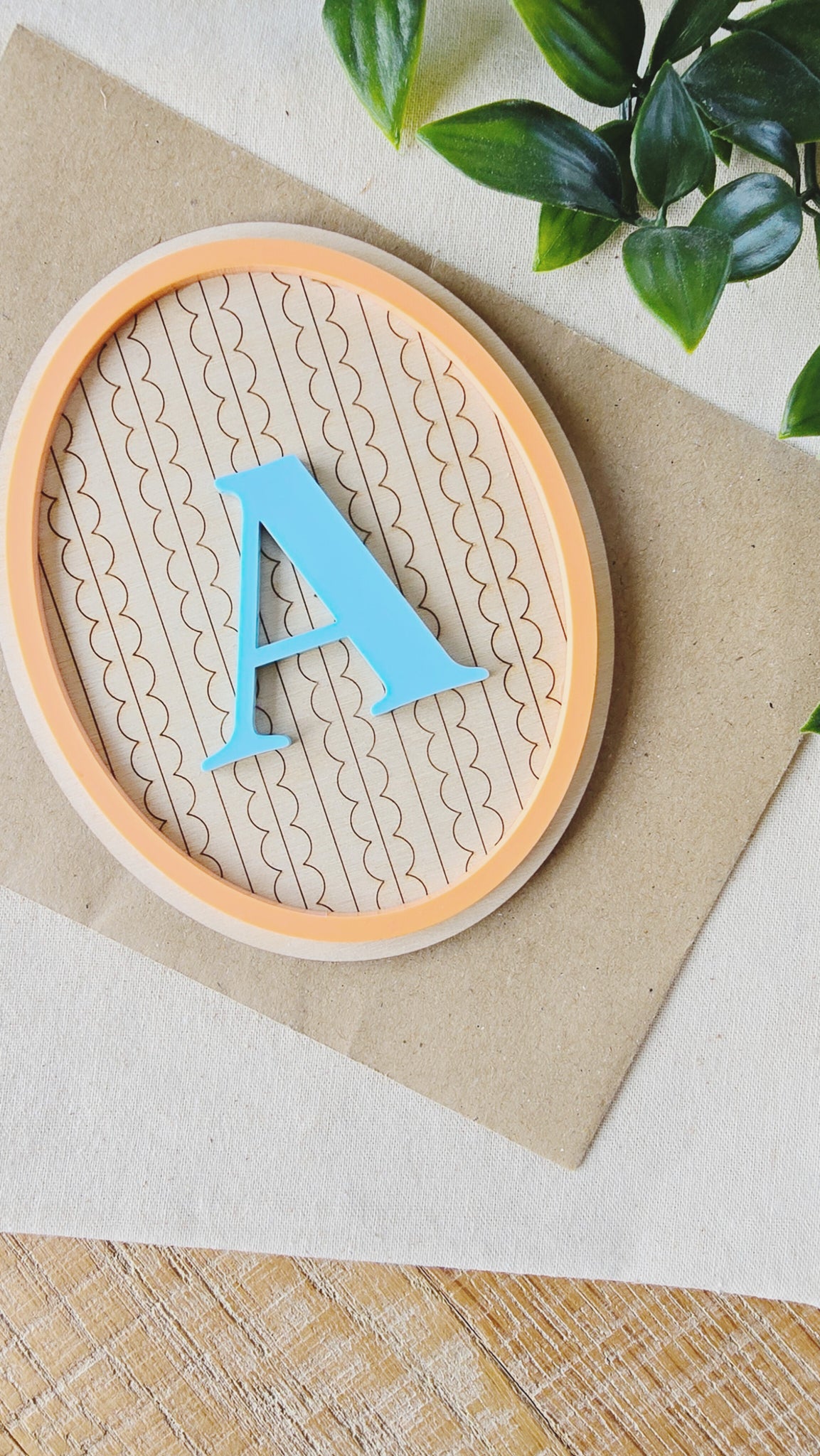 A fun twist on a classic monogram. This oval letter plaque features a playful scallop and stripe etched background, bold acrylic lettering, and a coloured border – all customisable to suit your space.