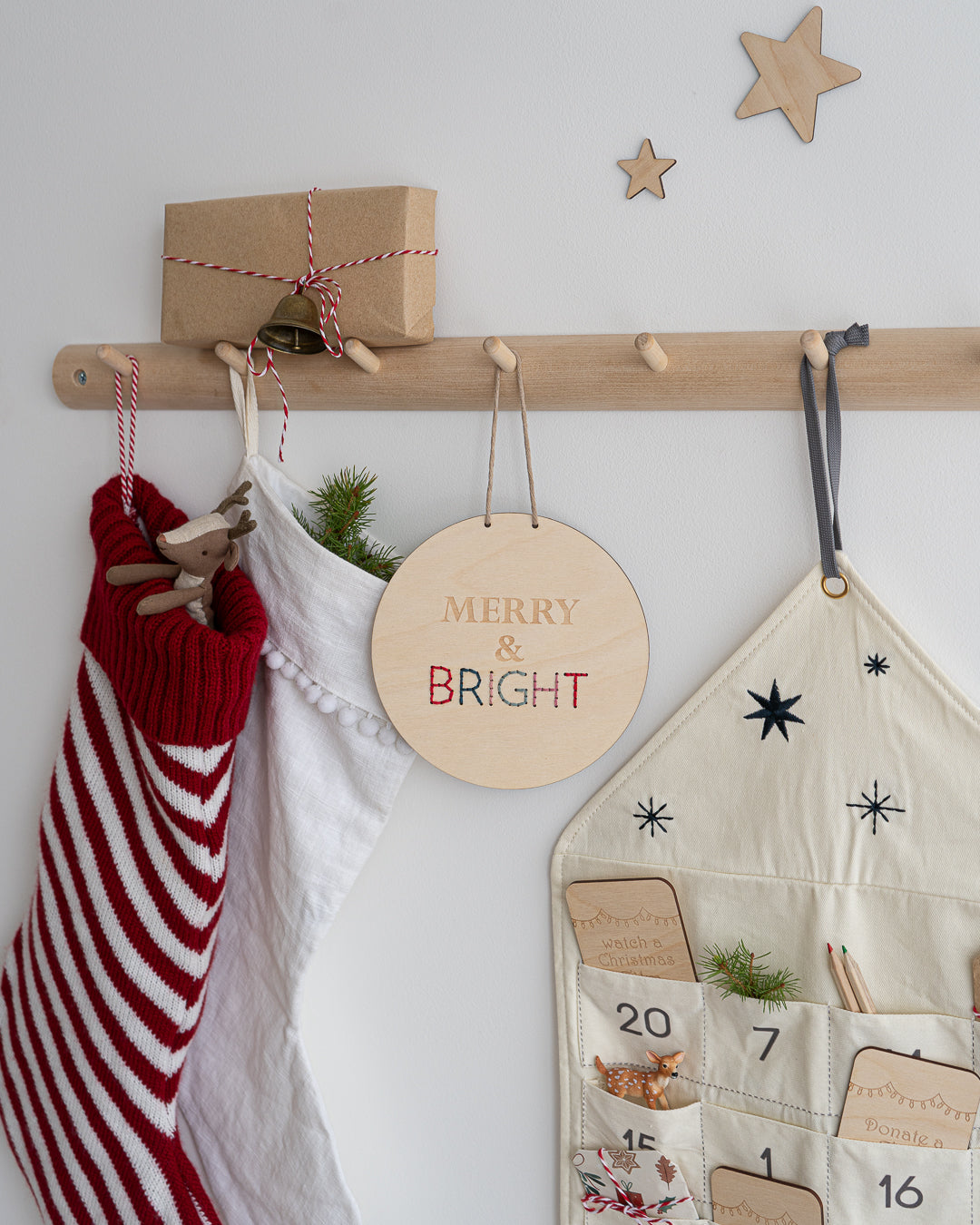 A wooden embroidered Christmas wall hanging. Engraved with the words 'Merry &' and the word 'bright' embroidered in a back stitch. Choose your own colours to match your festive home decor.